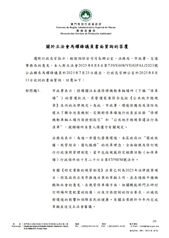 澳區政府環境保護局關於立法會馬耀鋒議員書面質詢的答覆如下: