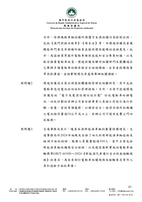 1、針對電動車維修可能衍生包括環境污染等危險因素,請問當局有否就相關修理機動車輛場所制訂適用的規管指引及維修人員要求?此外,當局又會否因應機動車輛發展的趨勢,及早開展包括第47/98/M號法令在內的法務檢討及修訂工作,使相關法律法規適配於當前需要?