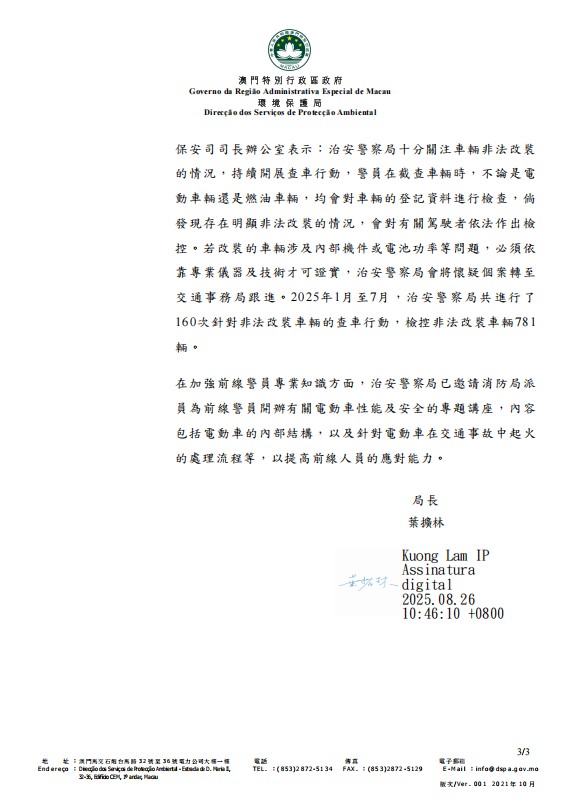 3、過去政府指出會向前線人員更新指引及檢驗要求,並加強培訓,請問相關工作執行的情況為何?在打擊電動車非法改裝方面,目前執法的成效又如何?