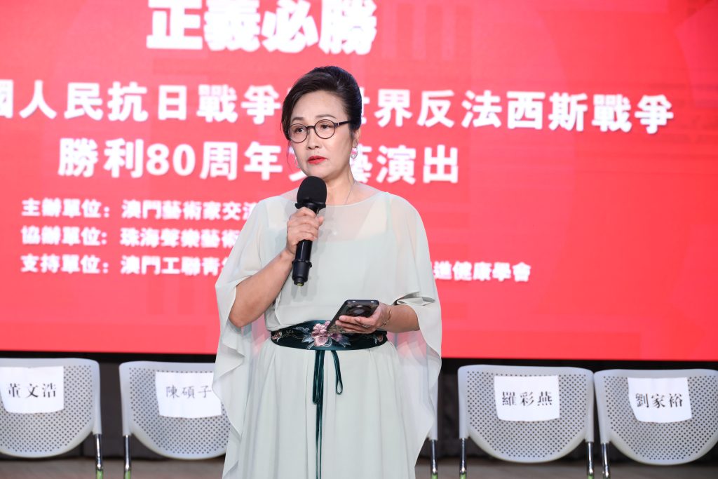 會長陳碩子博士致辭稱,偉大的抗戰精神,不僅鐫刻在歷史豐碑上,更在澳門的文化脈絡中傳承。今天舞台上的每一段旋律、每一句歌聲,都是珠澳兩地藝術家攜手之作 —— 我們以本土視角詮釋紅色記憶,讓家國情懷在中西交融的澳門文化土壤裡,生長出觸動人心的力量。恰逢中華人民共和國成立 76 週年,從站起來、富起來到強起來,祖國的每一步跨越,都為澳門的發展注入堅實力量;而澳門的穩定繁榮,也成為祖國和平發展畫卷中亮眼的一筆。此刻,我們以藝術為橋,既回望抗戰歲月、銘記歷史,也立足澳門、展望未來 —— 願我們繼續以文化為紐帶,讓抗戰精神在濠江兩岸薪火相傳,更以實幹擔當為「一國兩制」實踐續寫新篇章!