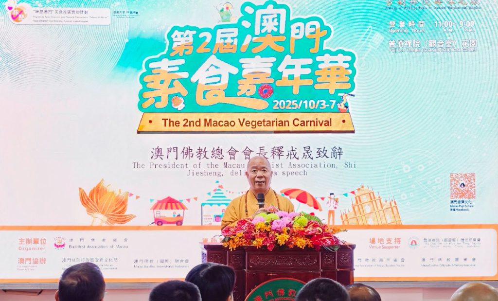 釋戒晟會長致詞表示,作為澳門「創意城市美食之都」的重要內涵,素食文化承載著可持續生活理念與生態保育意識。我們期待透過這場活動,讓參與者在色香味俱全的素食中,感受慈悲護生的精神,體悟人與自然和諧共處之道。這不僅是對澳門多元文化的精彩詮釋,更是對「愛國愛澳、珍惜地球」家園意識的具體實踐。