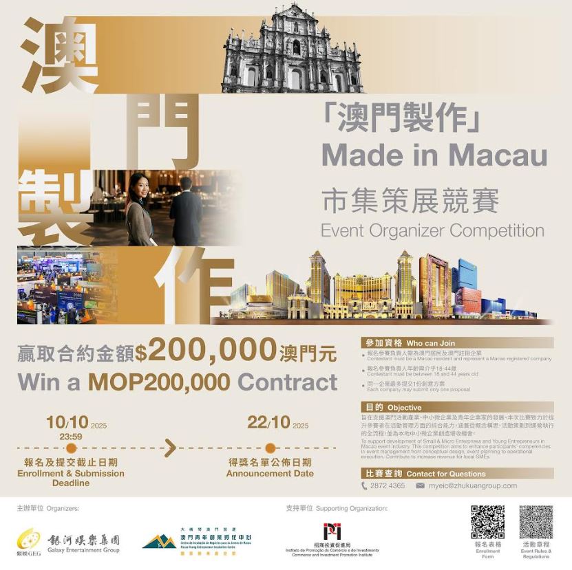 【環球新聞報訊】銀河娛樂集團(下稱「銀娛」)作為澳門首間推行「以大帶小」商業合作模式的綜合旅遊休閒企業,多年來致力以務實行動,支持本地中小微企及青創企業的可持續發展。在澳門特別行政區政府(下稱「特區政府」)招商投資促進局(下稱「招商局」)支持下,銀娛與澳門青年創業孵化中心(下稱「青創中心」)聯合主辦「『澳門製作』市集策展競賽」,由即日起至10月10日接受合資格的本地中小微企及青創企業報名參與。優勝者將有機會獲授予金額達澳門幣20萬元之合同,並於11月27日至28日在銀娛旗下物業後勤區舉辦為期兩日的「『澳門製作』市集」。