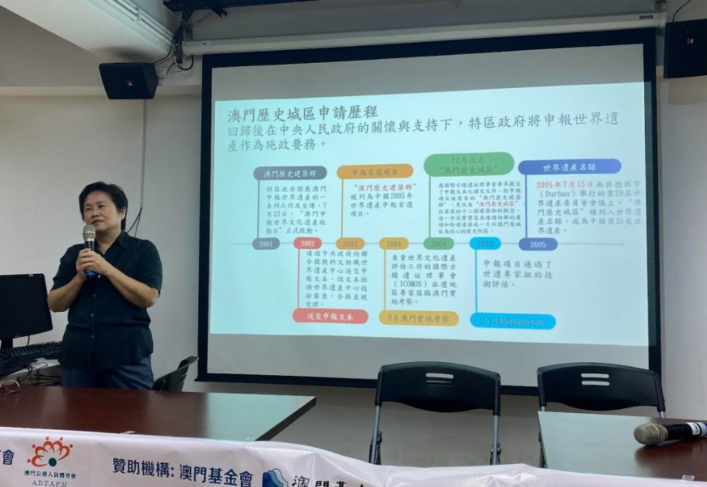 澳門口述歷史協會副會長及世選專業導賞員甄桂芳擔任主講嘉賓,她以生動及靈活的技巧,帶出澳門世遺城區的故事,由四百多年前的聖保祿書院(大三巴牌坊前身)到澳門如何申請世遺及非物質文化遺產的歷程,澳門世遺分佈點作出了詳盡的解釋,並與參加者互動民間對世遺的保育的建議,場面熱鬧.