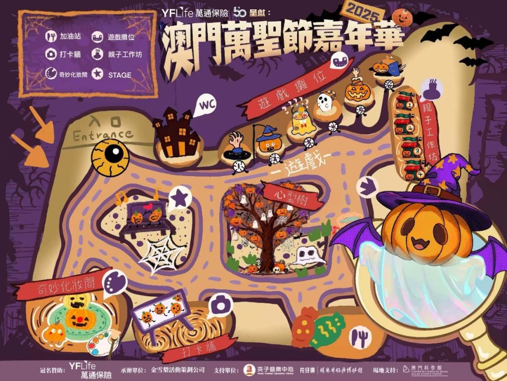 本次萬聖節嘉年華將於10月31日至11月2日假澳門科學館心形樹廣場舉辦,並推出「日間親子同樂・夜間音樂狂歡」雙場式主題安排。萬聖節嘉年華日間場(中午12時至傍晚6時)開放予所有公眾參與,現場設有科學探索工作坊,包括趣味科學實驗與萬聖主題科普活動,同時還安排南瓜魔法創作、文創精品手作、親子Cosplay互動等環節,並有兒童音樂表演和文創市集,氣氛溫馨愉快。夜間場(晚上6時30分至9時30分)則限18歲以上人士入場,內容包括夜間螢光人體彩繪、萬聖節主題闖關遊戲、萬聖特色美食及專業DJ與樂隊帶來的激情音樂演出,營造狂歡氛圍。