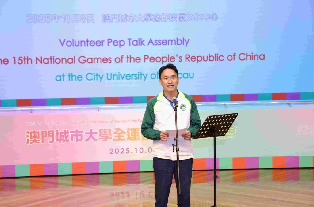 龔志明局長致辭時表示,城大積極響應全運會號召,派出超過700位志願者,充分展現學校對國家體育盛事的熱忱與擔當。同時,對志願者們無私奉獻的精神表示贊許,並勉勵大家以最佳狀態投入到服務中,展現澳門青年的專業素養和青春風采,共創精彩全運。