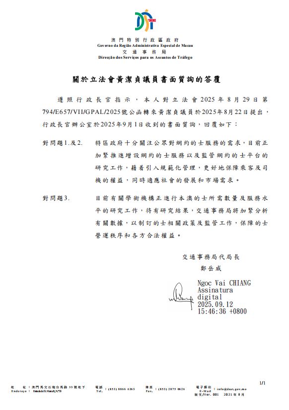 澳區政府交通事務局關於立法會黃潔貞議員書面質詢的答覆如下: