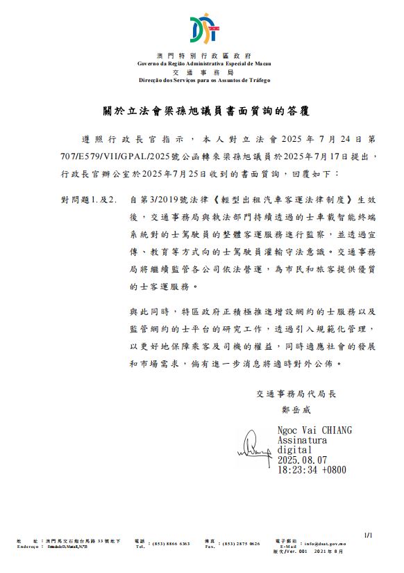澳區政府交通事務局關於立法會梁孫旭議員書面質詢的答覆如下: