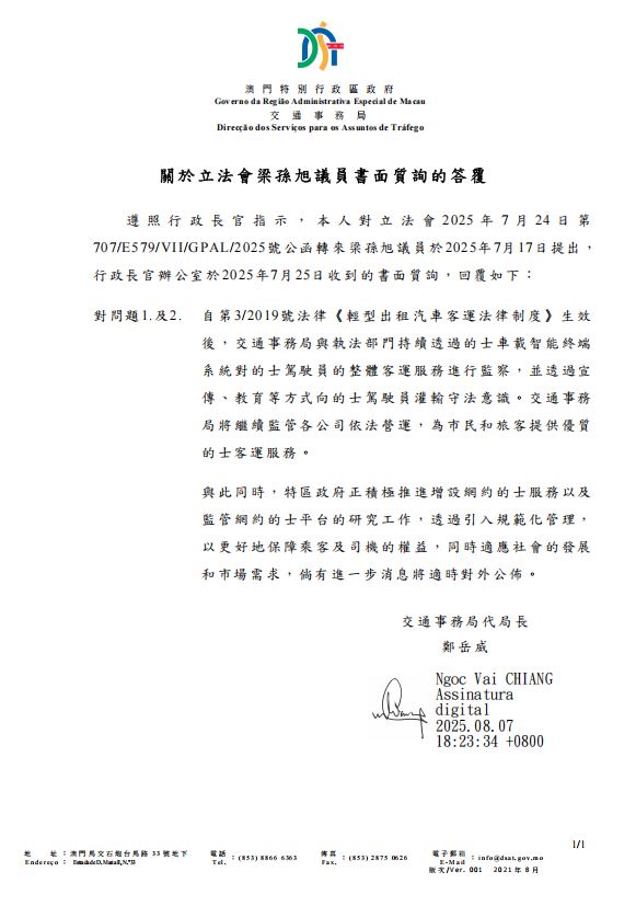 澳區政府交通事務局關於立法會梁孫旭議員書面質詢的答覆如下: