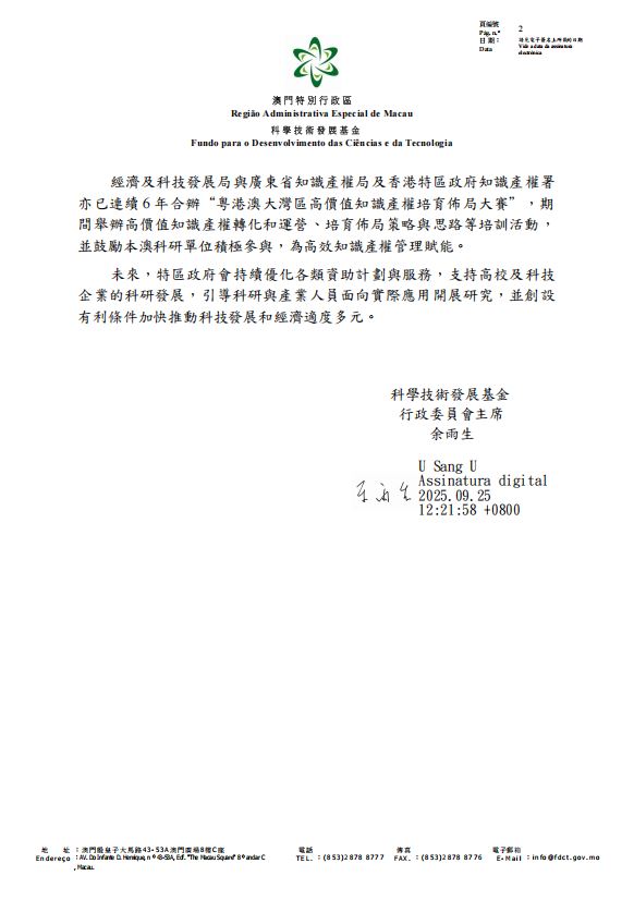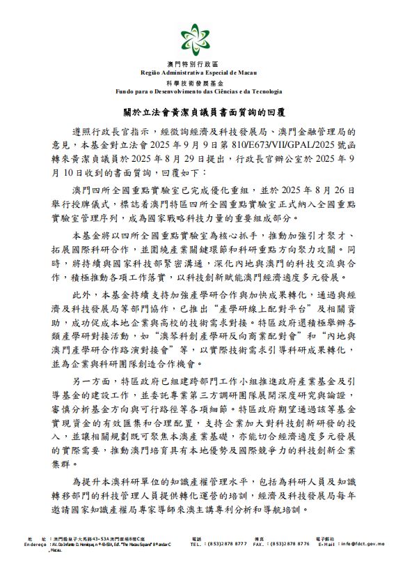 澳區政府科學技術發展基金關於立法會黃潔貞議員書面質詢的回覆如下: