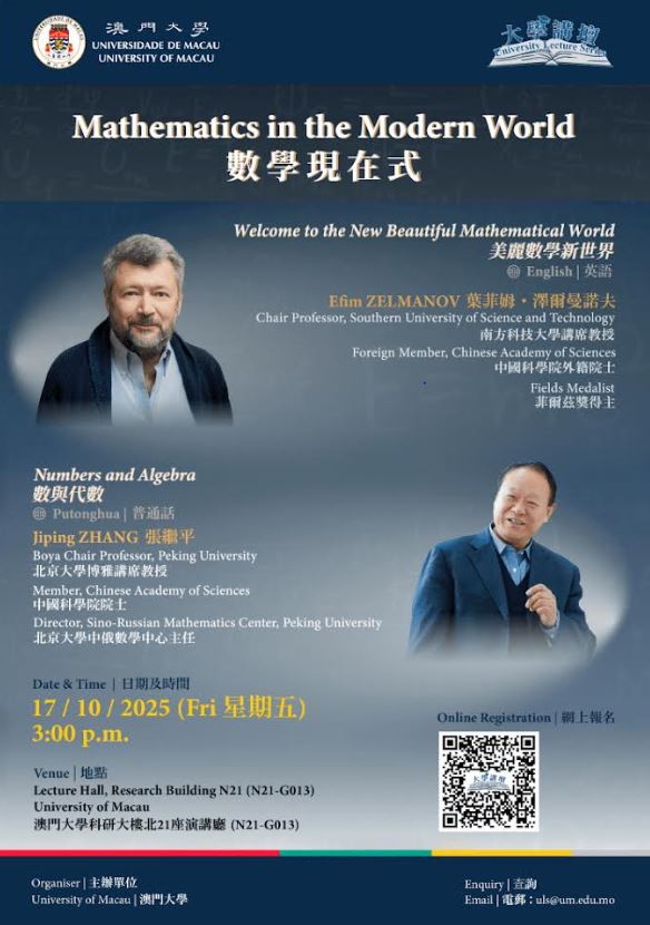 講座將於10月17日(星期五)下午三時以英文及普通話於澳大科研大樓北21座演講廳(N21-G013)舉行。報名網址: https://isw.um.edu.mo/evmapp/register/ULSmathsinmodernworld。查詢請致電+853 8822 8878或電郵至uls@um.edu.mo與黃小姐聯繫。
