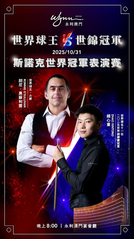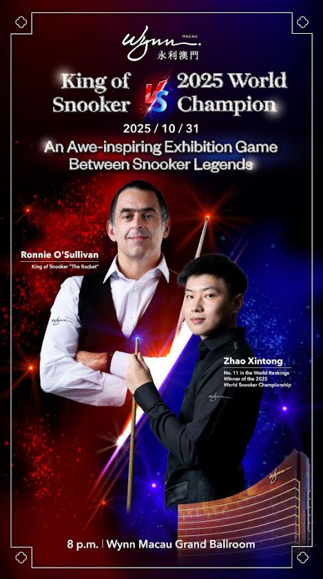 【環球新聞報訊】為支持特區政府「1+4」適度多元發展策略,以體育盛事推動體育與旅遊跨界融合,永利將於本月 31 日假永利澳門宴會廳舉辦「世界球王 vs. 世錦冠軍 • 斯諾克世界冠軍表演賽」。本次賽事特邀斯諾克傳奇球王——七屆世界錦標賽冠軍得主朗尼・奧蘇利雲(Ronnie O’Sullivan),與今年歷史性成為中國及亞洲首位斯諾克世錦賽冠軍的趙心童(Zhao Xintong)同場獻技,上演一場精彩絕倫的國際級斯諾克對決,為市民及旅客帶來難忘的體育盛宴。