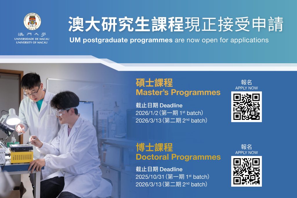 【環球新聞報訊】澳門大學2026/2027學年博士學位、碩士學位及學士後證書課程現正接受報名,申請人可於澳大官網直接報名,截止報名日期為2026年3月13日。