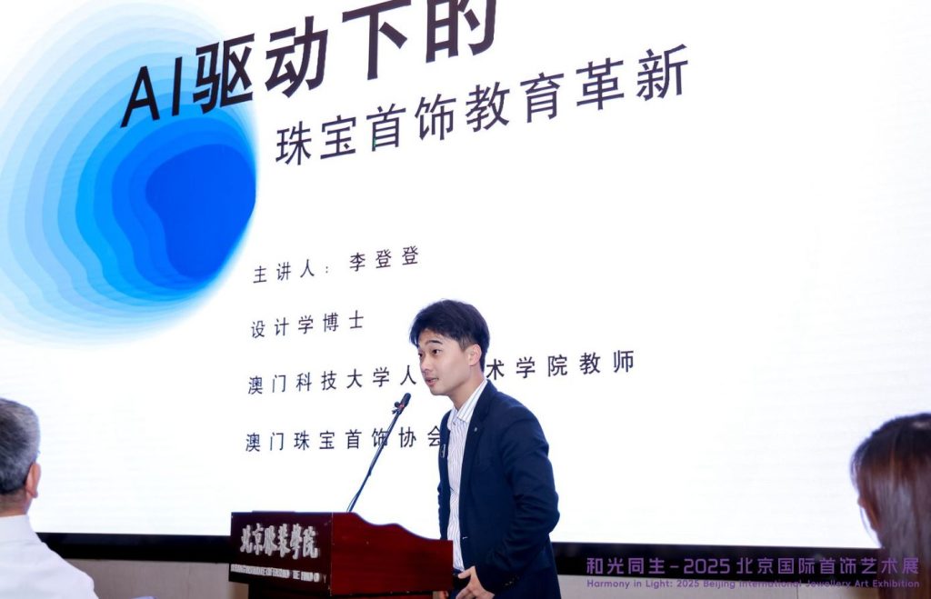 展覽特設 “首飾設計教育創新” 主題分享環節,李登登老師受邀發言,主題爲:AI驅動下的珠寶首飾教育革新,李老師結合自身主講的 “珠寶設計”“時尚設計” 等課程經驗,系統介紹了澳門科技大學首飾設計教育的現狀 —— 以 “理論 + 實踐 + 創新” 爲核心,構建多學科融合的課程體系,注重培養學生的藝術感知與技術應用能力。
