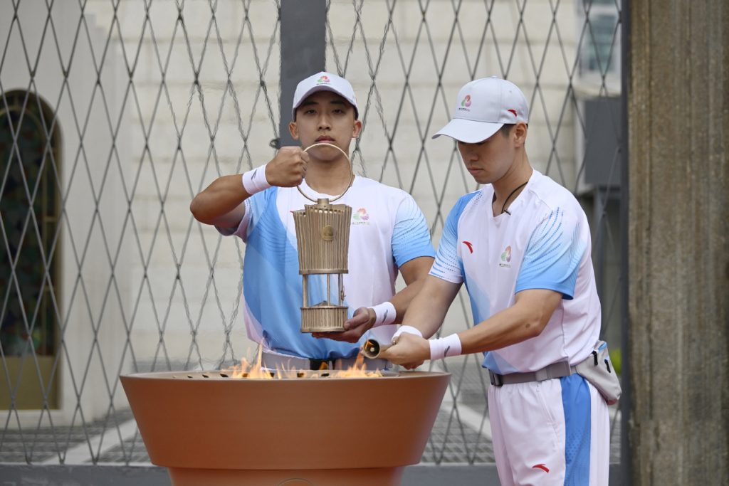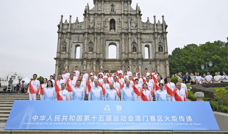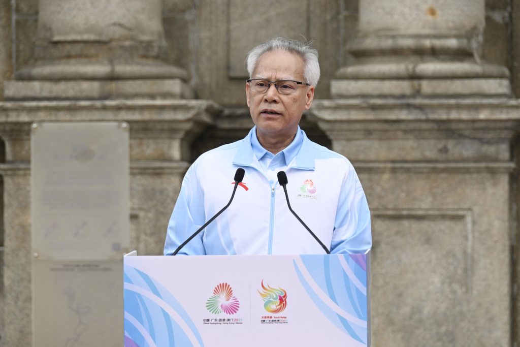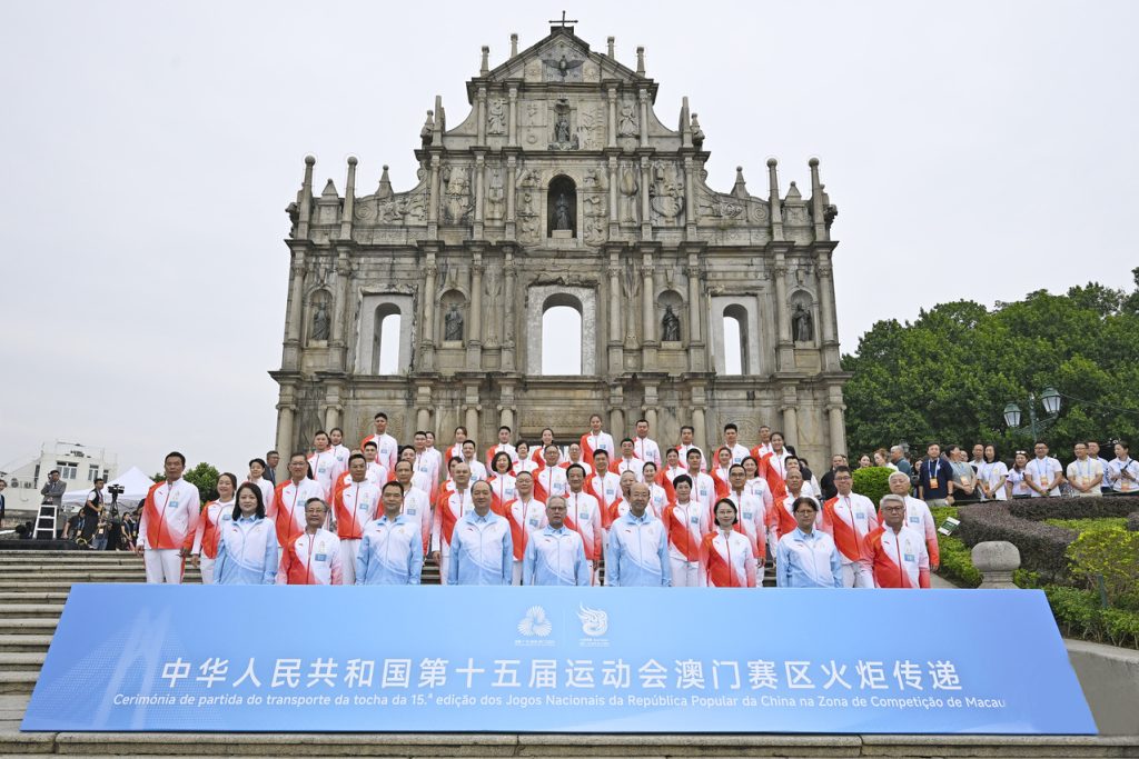 行政長官岑浩輝,中聯辦主任鄭新聰,外交公署特派員劉顯法,社會文化司司長柯嵐等出席。岑浩輝致辭表示,全運聖火象徵著光明與希望;火炬傳遞,是精神的傳遞,更是力量的凝聚。每一步都展現了澳門奮發同行的城市風采,每一次交接都傳承著團結拼搏的體育精神。此刻,聖火在大三巴牌坊前匯聚,共同點亮了「灣區同心 全運同行」的璀璨之光。