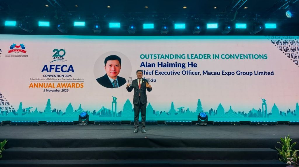 【環球新聞報訊】11月5日至7日,亞洲展覽會議協會聯盟(AFECA)2025年年會暨20周年慶典在印尼雅加達盛大舉辦。在大會「AFECA年度獎項」頒獎儀式上,澳門會展旅遊業協會會長何海明憑借在會展領域的卓越領導力與突出貢獻,榮獲「會議業傑出領袖(Outstanding Leader in Conventions)」獎項,並成功躋身首屆「AFECA領袖殿堂」,與全球行業精英共同成為亞洲會展業標杆,為澳門會展業贏得國際社會的高度贊譽。這也是首位澳門會展人獲得個人國際會展獎項!