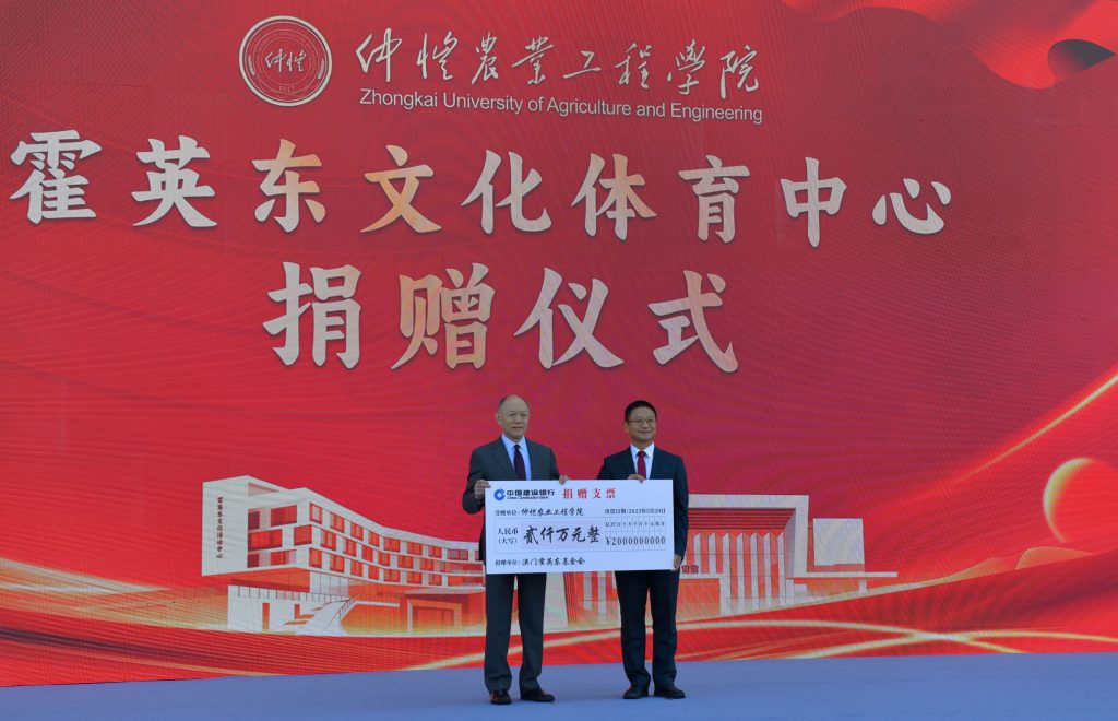 儀式上,霍震寰先生代表澳門霍英東基金會進行捐贈,廖明校長代表學校接受捐贈並向霍震寰先生贈送捐贈證書。與會領導嘉賓共同為霍英東體育館、霍英東文化活動中心揭牌。