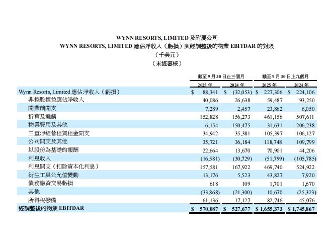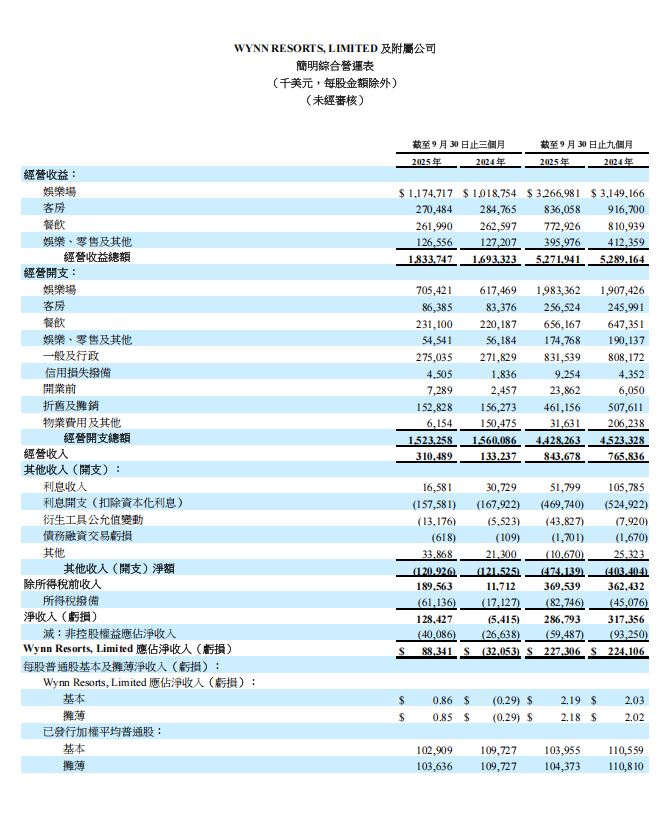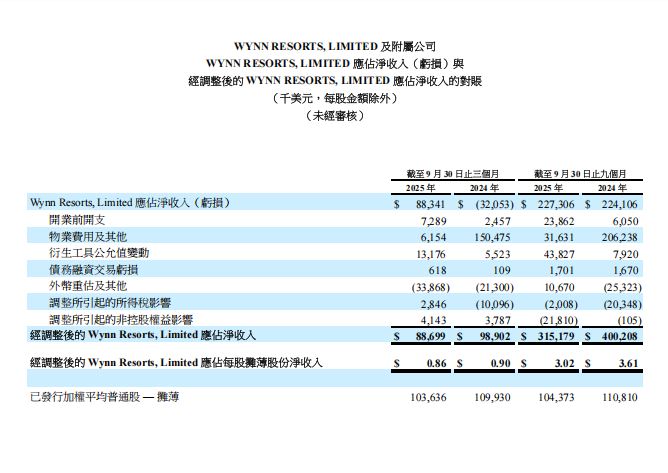 2025 年第三季的 Wynn Resorts, Limited 應佔淨收入為 8,830 萬美元,而 2024 年第三季 Wynn Resorts, Limited 應佔淨虧損則為 3,210萬美元。2025年第三季的每股攤薄淨收入為 0.85美元,而 2024年第三季的每股攤薄淨虧損為 0.29美元。