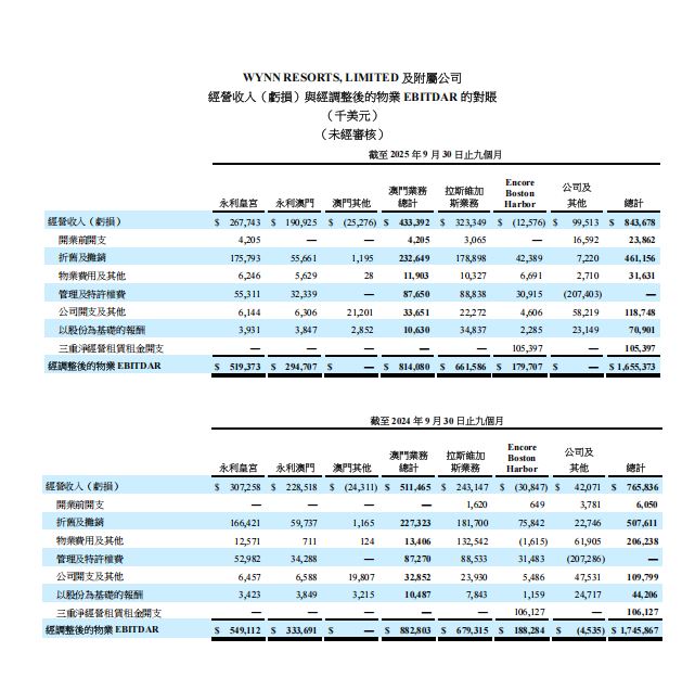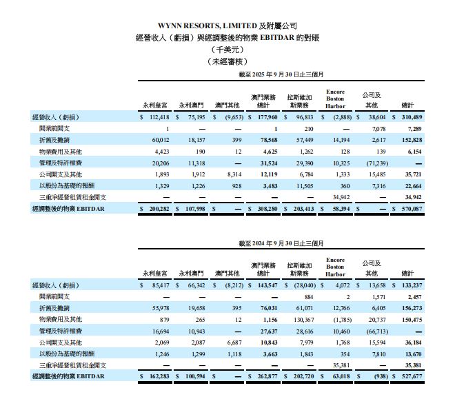 本公司已於本公佈附表載入(i) Wynn Resorts, Limited 應佔淨收入(虧損)與經調整後的 Wynn Resorts, Limited 應佔淨收入的對賬,(ii)經營收入(虧損)與經調整後的物業 EBITDAR 的對賬,及(iii)Wynn Resorts, Limited 應佔淨收入(虧損)與經調整後的物業EBITDAR 的對賬。