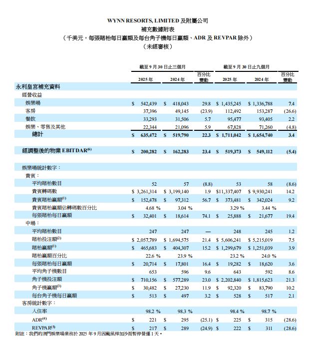 2025 年第三季永利皇宮的經營收益為 6.355 億美元,較 2024 年第三季的 5.198 億美元增加 1.157 億美元。2025 年第三季永利皇宮經調整後的物業 EBITDAR 為 2.003 億美元,而 2024 年第三季則為 1.623 億美元。中場業務的賭枱贏額百分比為 22.6%,低於 2024 年第三季錄得的 23.9%。貴賓賭枱贏額佔轉碼數百分比為 4.68%,高於 3.1%至 3.4%的物業預期範圍,並高於 2024 年第三季錄得的 3.04%。