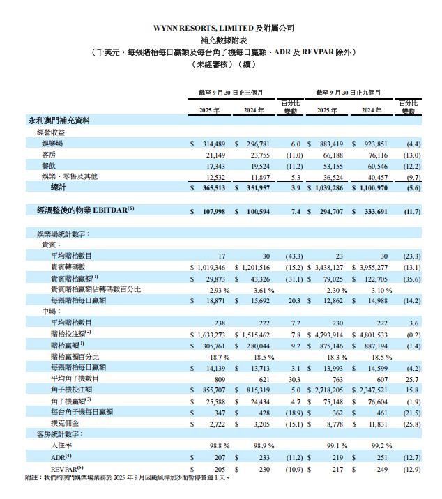 2025 年第三季經調整後的 Wynn Resorts, Limited 應佔淨收入(2)為 8,870 萬美元或每股攤薄淨收入 0.86 美元,而 2024 年第三季經調整後的 Wynn Resorts, Limited 應佔淨收入為 9,890 萬美元或每股攤薄淨收入 0.90 美元。