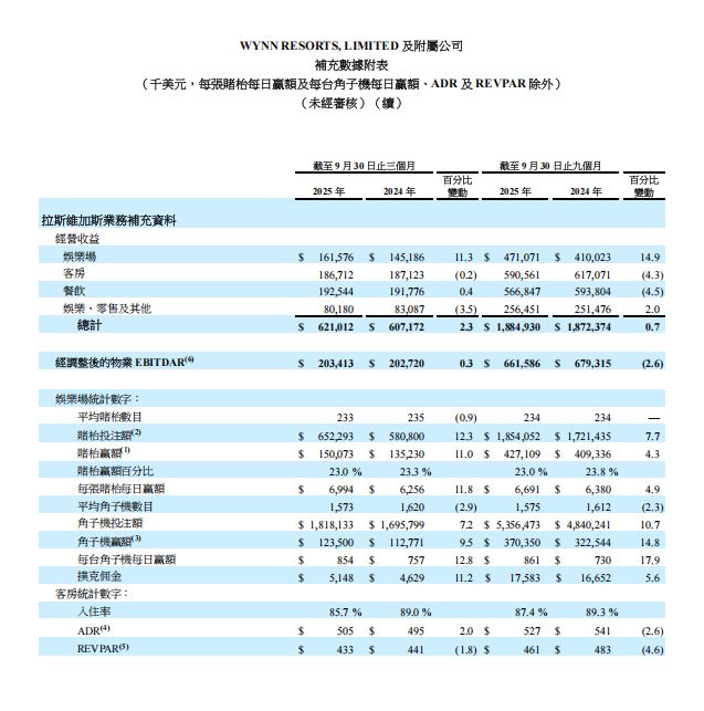 2025 年第三季的經營收益為 18.3 億美元,較 2024 年第三季的 16.9 億美元增加 1.404 億美元。2025 年第三季的 Wynn Resorts, Limited 應佔淨收入為 8,830 萬美元,而 2024 年第三季 Wynn Resorts, Limited 應佔淨虧損則為 3,210 萬美元。2025 年第三季的每股攤薄淨收入為 0.85 美元,而 2024 年第三季的每股攤薄淨虧損為 0.29 美元。2025 年第三季經調整後的物業 EBITDAR(1)為 5.701 億美元,而 2024 年第三季經調整後的物業 EBITDAR 為 5.277 億美元。