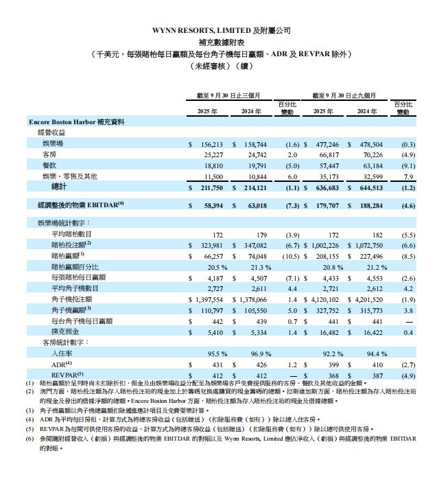 2025 年第三季 Encore Boston Harbor 的經營收益為 2.118 億美元,較 2024 年第三季的 2.141 億美元減少 240 萬美元。2025 年第三季 Encore Boston Harbor 的經調整後的物業 EBITDAR 為 5,840 萬美元,而 2024 年第三季則為 6,300 萬美元。2025 年第三季的賭枱贏額百分比為 20.5%,介乎 18%至 22%的物業預期範圍,並低於 2024 年第三季錄得的 21.3%。