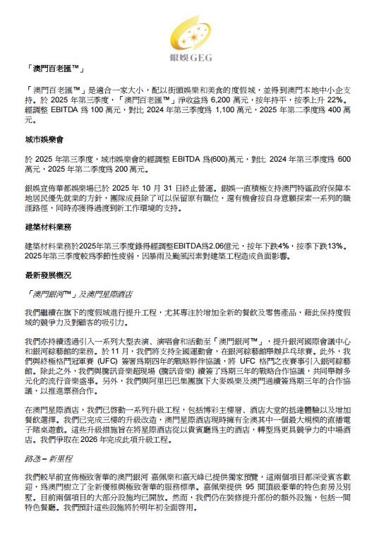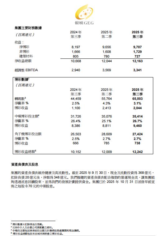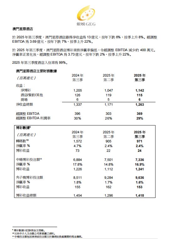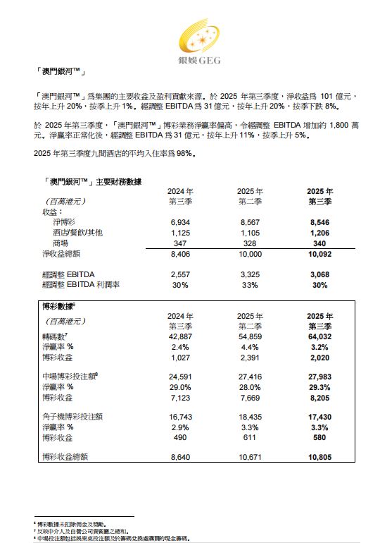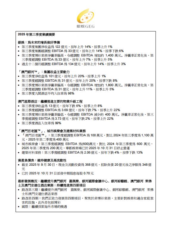 銀河娛樂集團 (「銀娛」、「公司」或「集團」)(香港聯合交易所股份代號:27)今天公佈截至 2025 年 9 月 30 日止三個月期間之業績。(除另有註明以外,所有金額以港元列示)