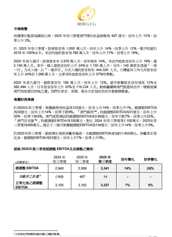 銀娛主席呂耀東先生表示:「今日我很高興向大家報告集團於 2025 年第三季度之財務業績。於 2025 年第三季度集團淨收益按年上升 14%至 122 億元,經調整 EBITDA 按年上升 14%至 33 億元。