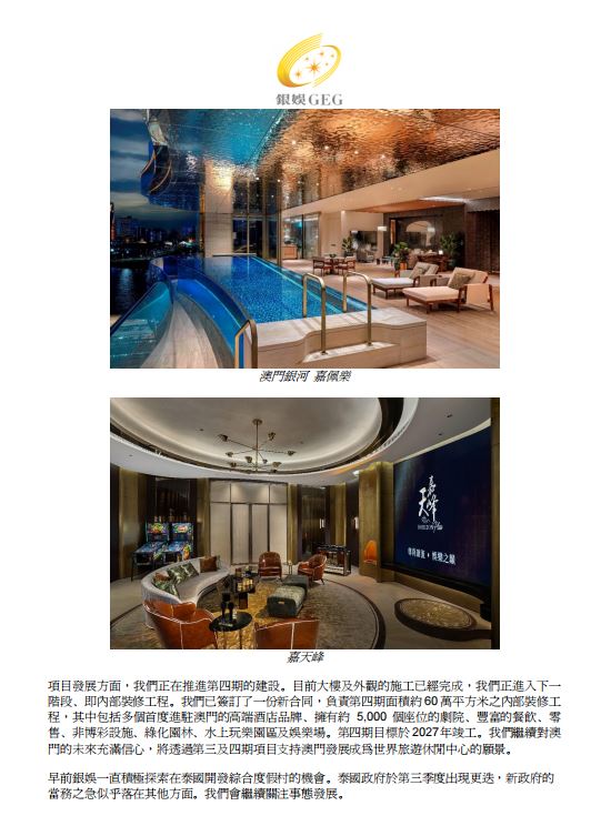 早前銀娛一直積極探索在泰國開發綜合度假村的機會。泰國政府於第三季度出現更迭,新政府的當務之急似乎落在其他方面。我們會繼續關注事態發展。