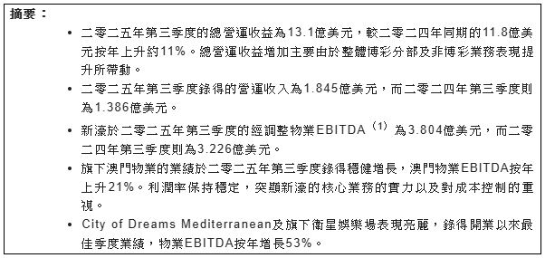 新濠於二零二五年第三季度的經調整物業EBITDA(1)為3.804億美元,而二零二四年第三季度則為3.226億美元。