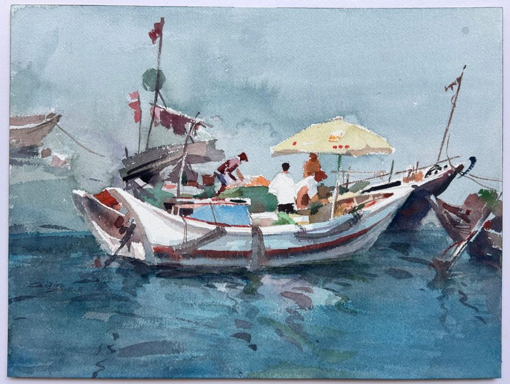 本次展覽以「閩澳風光」為創作主題,通過藝術家的細膩筆觸,將兩地歷史與當下的文化圖景串聯一起。展覽作品呈現閩南紅磚古厝的飛檐翹角、海絲港灣的潮汐光影,與澳門歷史街區的葡式花窗、中西合璧的建築肌理交相輝映,更不乏市井生活的鮮活氣息—從泉州古城的煙火早市到澳門街巷的午後咖啡,地域文化在水色間流轉。
