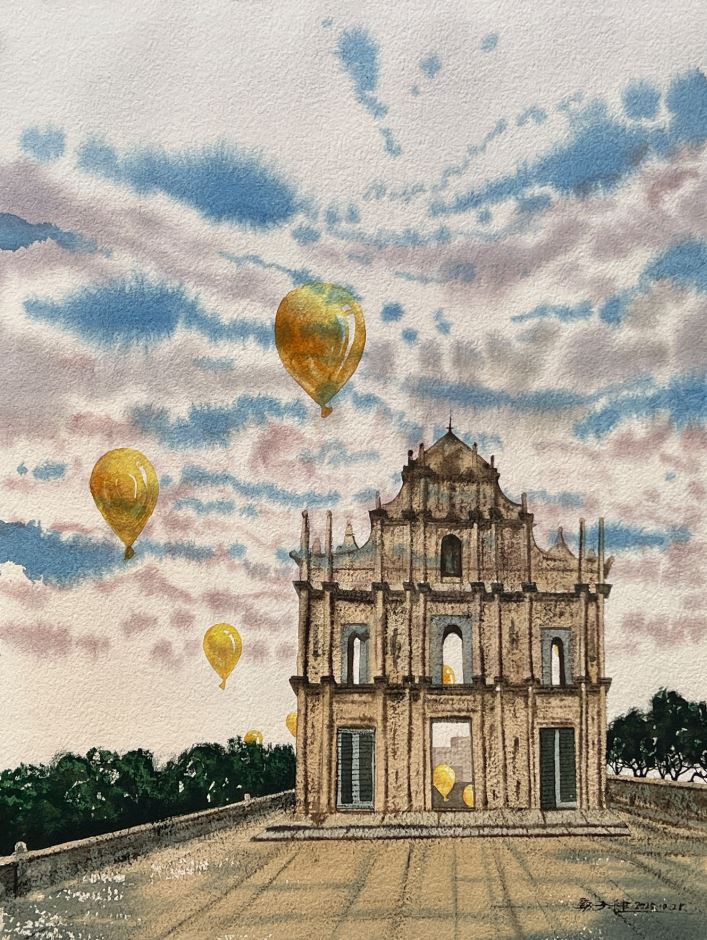 郭子健作品以「閩澳」為文化坐標,借細膩水色編織兩地的歷史肌理與生活體溫。閩南紅磚古厝的飛檐、海絲餘韻裏的海螺意象,與澳門大三巴的巴洛克輪廓、葡式建築的石材質感並置,在虛實構圖中完成地域美學的對話——古厝的暖紅與教堂的淺褐,是鄉土煙火與殖民遺存的色彩和解,懸浮的海螺、氣球則以超現實筆法,勾連「海絲起點」與「中西口岸」的共情。