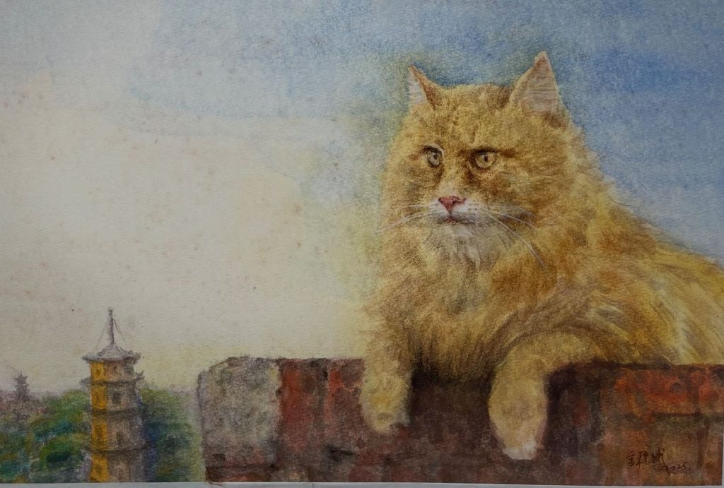 金程斌以虛實構圖重構地域美學:貓的具象質感錨定市井溫度,而建築的虛化筆觸則沉澱歷史肌理,閩南早市的煙火氣與澳門 午後的慵懶感,皆融於水彩的通透質地中。作品並非景觀復刻, 而是以「生靈+城影」的意象組合,將閩澳的文化差異轉化爲共生的生活詩意——在水色流動裏,地域符號退爲背景,日常生靈的鮮活氣息成爲文明交融的注腳。