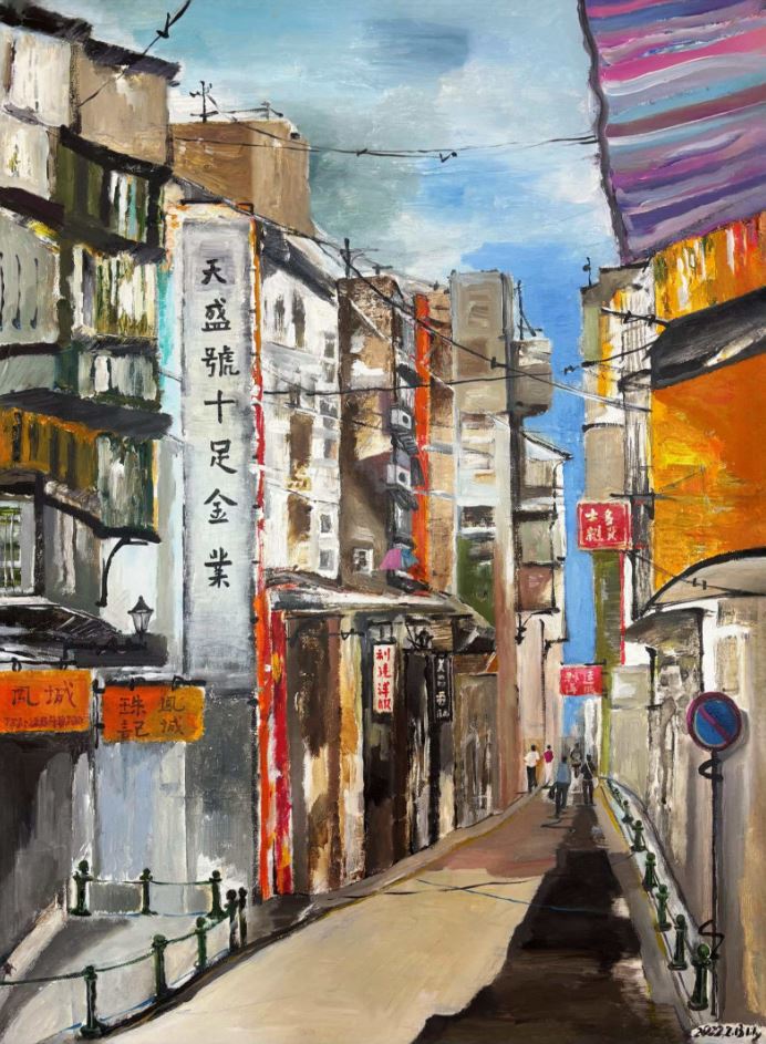 Lily 的畫筆,從不滿足於復刻地標,而是以「新澳門人」的獨特視角,敏銳地挖掘著小城裡那些被忽略的細節。水彩的通透、油畫的沉厚與丙烯的銳度,共同調和出她獨特的藝術語言 —— 這既是雙重文化身份在她生命畫布上的交融,亦是她對澳門這座城市的深情凝視。在此凝神駐足,於方寸之間,見天地,見歷史…… 在此,見彼!
