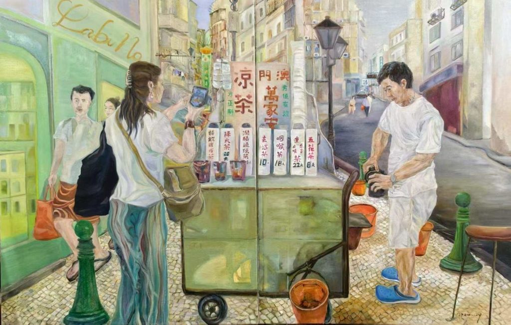 作為一位紮根澳門二十多載的創作者,Lily 此次展出的 28 幅畫作,包含油畫、丙烯、水彩、墨彩,正是「此」與「彼」的交織產物。《畫說澳門涼茶》系列,見生活之道;《澳門煙火》系列,見時間之痕;《古往今來》澳門歷史人物系列,是與先賢的對話,藉由前輩們的精神火炬,探尋一座城市的歷史脈絡。