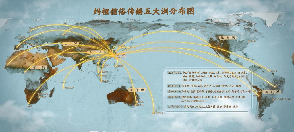 隨著中國航海業的發展,媽祖信仰逐漸傳播到世界各地,媽祖護佑航運的功跡舉世聞名,使得每興一座港口,媽祖廟隨之而建,媽祖文化也隨之紮根於所在區域,逐漸形成「有海水處有華人,有華人處有媽祖」的世界性文化現象,如今,全球 50 個國家和地區分佈著 1.1 萬餘座媽祖宮廟,敬仰者超過 3 億人。