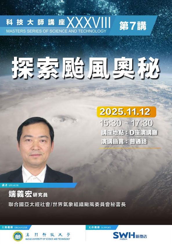 【環球新聞報訊】由澳門科技大學主辦,新偉浩進出口貿易有限公司支持的本學期第七場科技大師講座將於11月12日(週三)下午15:30在大學D座演講廳舉行,聯合國亞太經社會/世界氣象組織颱風委員會秘書長端義宏研究員主講。