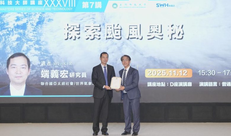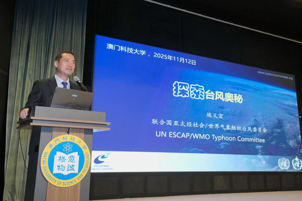 【環球新聞報訊】由澳門科技大學主辦的「科技大師講座」系列講座之「探索颱風奧秘」於 2025 年 11 月 12 日(星期三)下午在 澳科大D座 禮堂成功舉辦。本講座邀請到聯合國亞太經社會 / 世界氣象組織颱風委員會秘書長端義宏研究員主講。澳科大副校監、校長李行偉講座教授為本次講座致辭,並向端研究員頒發聘書及致送紀念品。