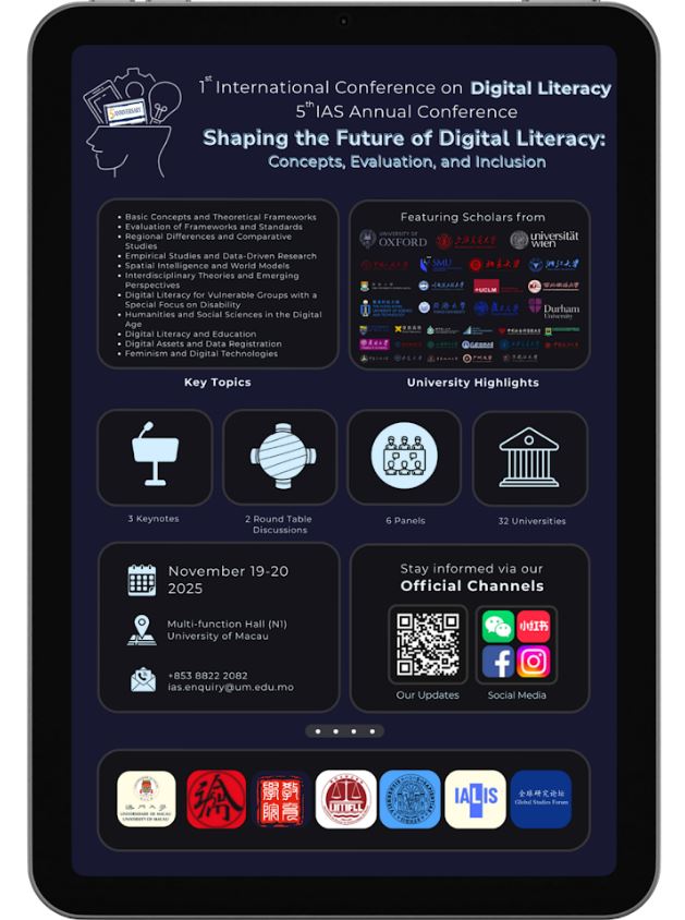 【環球新聞報訊】為推動跨學科研究與國際對話,澳門大學人文社科高等研究院將於11月19至20日舉行第一屆數字素養國際會議暨第五屆高研院周年學術研討會,匯聚全球逾50位專家學者,圍繞“塑造數字素養的未來:概念、評估與包容性”的主題,以實證研究、理論探討與政策分析為基礎,進行批判性對話和合作探究,推進以包容性和倫理為基礎的數字未來。歡迎有興趣人士參加。