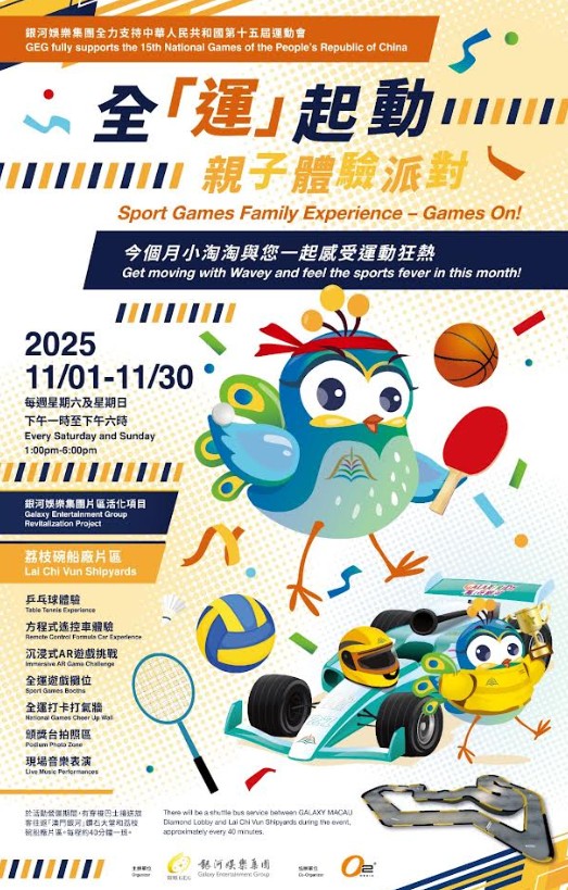 【環球新聞報訊】銀河娛樂集團(下稱「銀娛」)多年來持續以多元方式支持、舉辦及參與多項大型體育品牌盛事及活動,推動澳門建設「體育之城」,同時發揮「旅遊+體育」的協同效應。適逢「中華人民共和國第十五屆運動會」(下稱「十五運會」)及「第72屆澳門格蘭披治大賽車」(下稱「大賽車」)於11月盛大舉行,銀娛作為十五運會澳門賽區及大賽車的贊助商,特意於即日起至11月30日逢周末在銀娛片區活化項目荔枝碗船廠片區舉辦「全『運』起動親子體驗派對」,結合十五運會及大賽車的特色元素,設計多個寓教於樂的親子互動體驗區及主題遊戲攤位,讓市民、旅客均能一同感受體育盛事的熱烈氣氛及魅力。