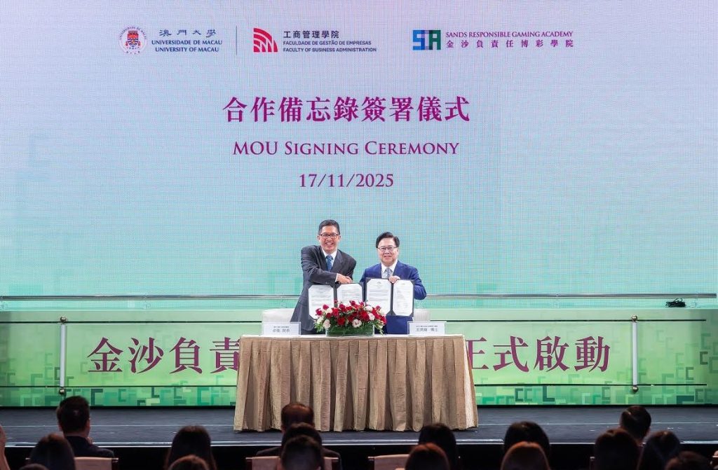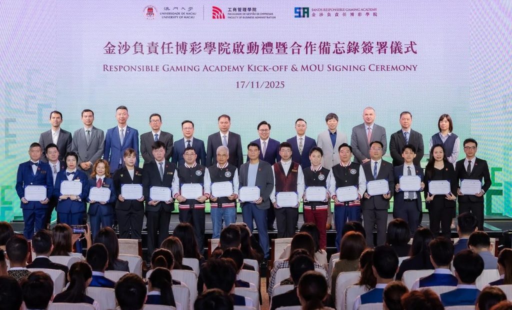 【環球新聞報訊】金沙中國有限公司周一在澳門倫敦人為金沙負責任博彩學院舉行啟動禮,並與澳門大學簽署負責任博彩合作備忘錄,同場亦向修畢了由金沙中國與澳門大學博彩研究所攜手設計的「RG360 – 澳門負責任博彩專業大使課程」的學員頒發證書,標誌著雙方在負責任博彩領域的產學研合作邁向新里程。