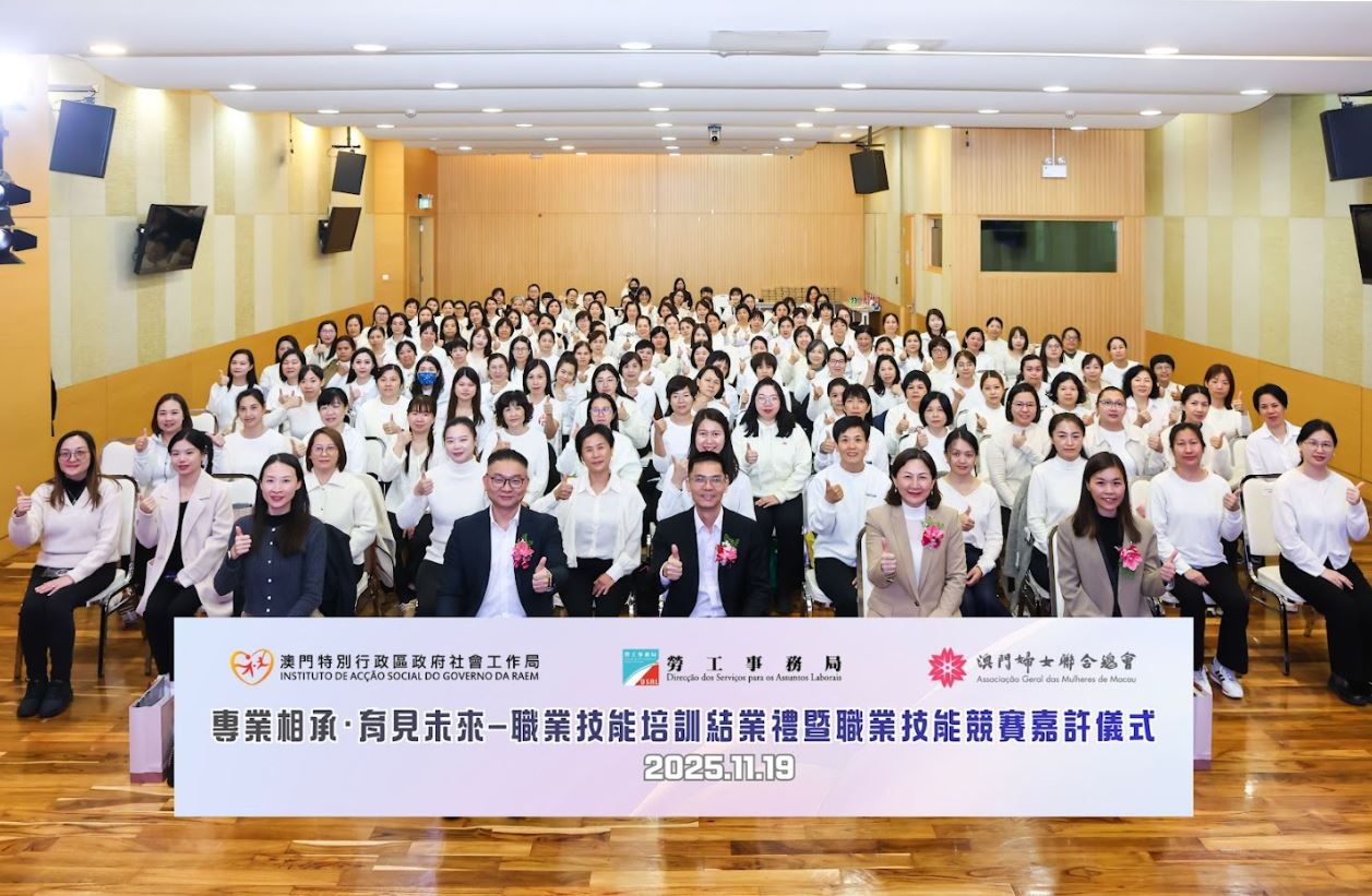 【環球新聞報訊】由社會工作局、勞工事務局和婦聯總會合辦的“專業相承·育見未來──職業技能培訓課程結業禮暨職業技能競賽嘉許儀式”,於十一月十九日在婦聯綜合服務大樓五樓何賢禮堂舉行,共嘉許一百八十名學員及競賽得獎者,旨在肯定學員努力、展示培訓成果,並促進業界交流。