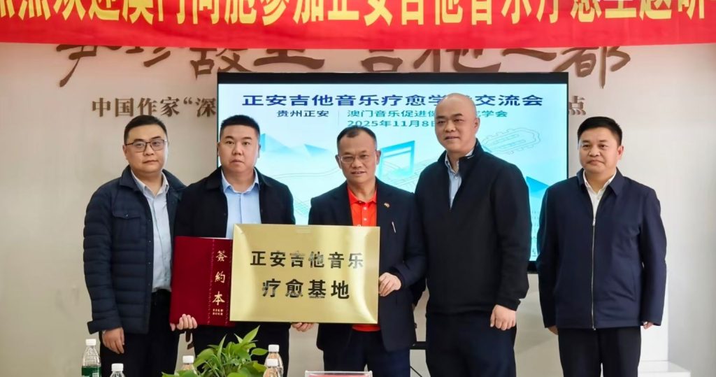 活動尾聲,澳門專家團隊與現場嘉賓共同唱響《永遠跟黨走》,用深情歌聲抒發愛國愛澳情懷,將活動推向高潮。據悉,正安吉他音樂康養基地的建立,是澳門精準醫學學會「醫學 + 音樂」跨學科合作的重要實踐,也是正安延伸吉他產業鏈、提升產業附加值的關鍵一步。未來,雙方將持續深化課程研發、人才培養、學術交流等領域合作,讓音樂成為促進民眾健康、助力鄉村振興的重要力量,不斷續寫黔澳兩地合作共贏、友誼長存的新篇章。