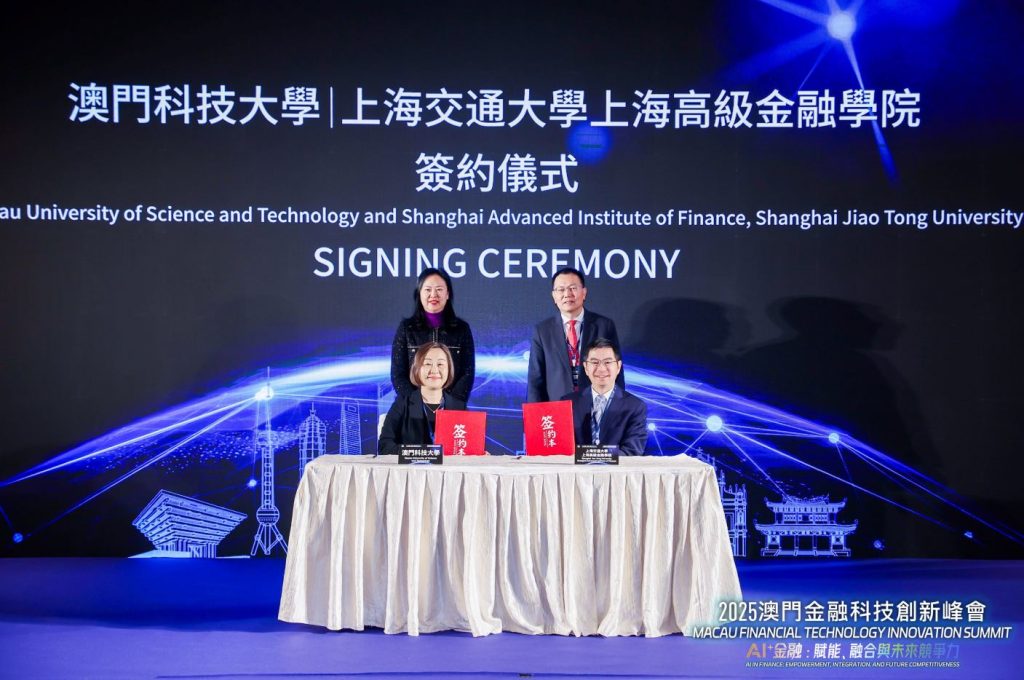 在峰會開幕式上,澳科大商學院院長盛妮與上海高金副院長張涌分別代表雙方簽署戰略合作備忘錄。在澳科大陳季敏副主席與嚴弘副院長的共同見證下,雙方約定未來將在金融科技領域加强合作,共同推動人才培養、前沿研究及創新項目孵化,深化滬澳兩地産學研協同發展。