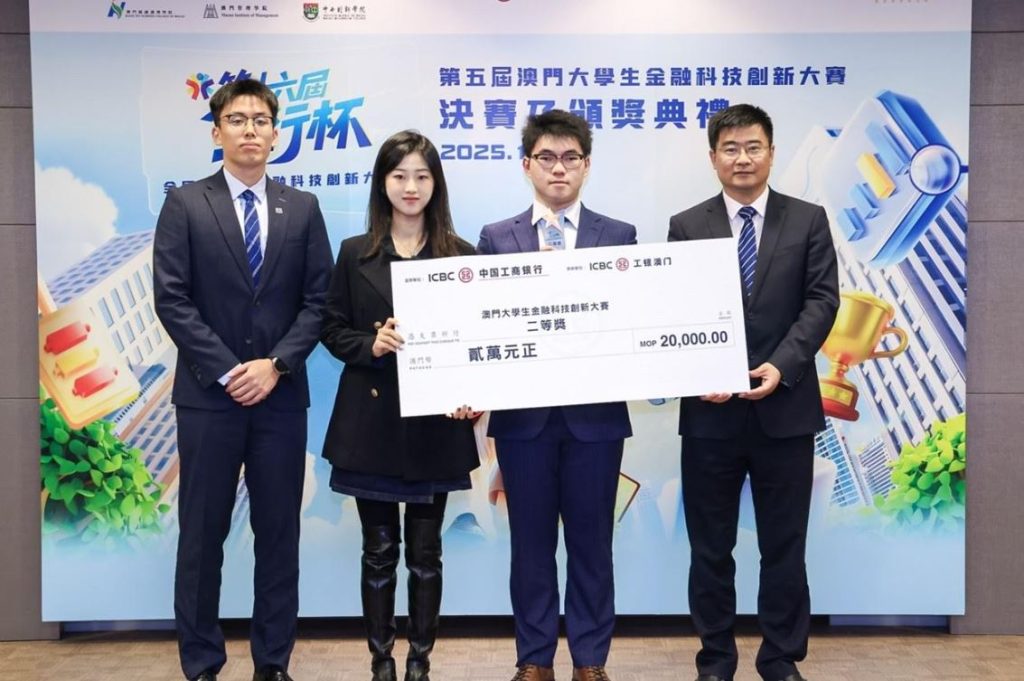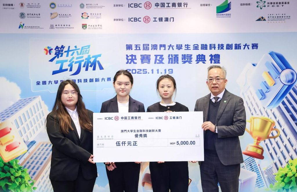 【環球新聞報訊】由中國工商銀行主辦、工銀澳門承辦的「2025『工行杯』全國大學生金融科技創新大賽之第五屆澳門大學生金融科技創新大賽」於2025年11月19日假置地廣場工銀(澳門)中心舉行決賽及頒獎典禮。澳門科技大學商學院的學生積極參加,憑藉優秀表現突圍而出,勇奪二等獎及優秀獎。