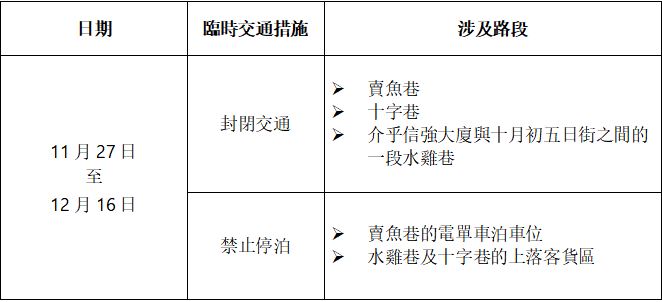 賣魚巷水管鋪設工程 作者: admin 发布: 2025年11月25日 9阅读 【環球新聞報訊】澳門自來水將於11月27日至12月16日,在賣魚巷、水雞巷及十字巷一帶進行水管鋪設工程。獲市政署核准並經交通事務局協調,澳門電訊及私人公司將一併進行管道鋪設及接駁街渠工程。屆時相關街道將實施臨時交通安排(詳情可查閱附表),敬請市民及駕駛者出行前留意。如有查詢,請致電客戶熱線:2822 0088。