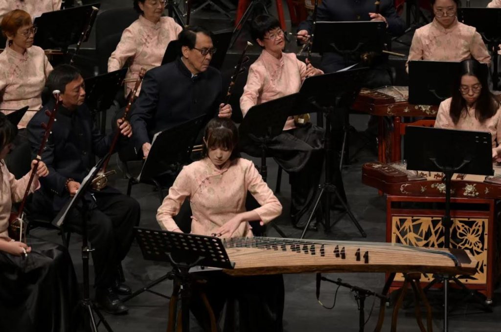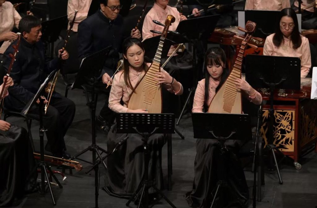 古箏協奏曲《漁舟唱晚主題隨想曲》由古箏首席葉樂怡獨奏,她以嫺熟指法與細膩呼吸,在經典主題上拓展出個人風格,勾勒出水鄉意境,兼具敘事性與畫面感。揚琴協奏曲《憶事曲》由揚琴首席張燕儀領奏,作品曾斬獲全國民族器樂比賽獎項,演繹中體現揚琴「清脆透亮、顆粒分明」的音色特質,旋律綿長、情感克制。琵琶協奏曲《春江花月夜》由梁敏儀與林沁怡聯合領奏,二人師承名家,以默契對答與富有韻味的指法,在民族管弦襯托下,將「月夜春江」的朦朧與詩意演繹得極具感染力,成為全場高光之一。