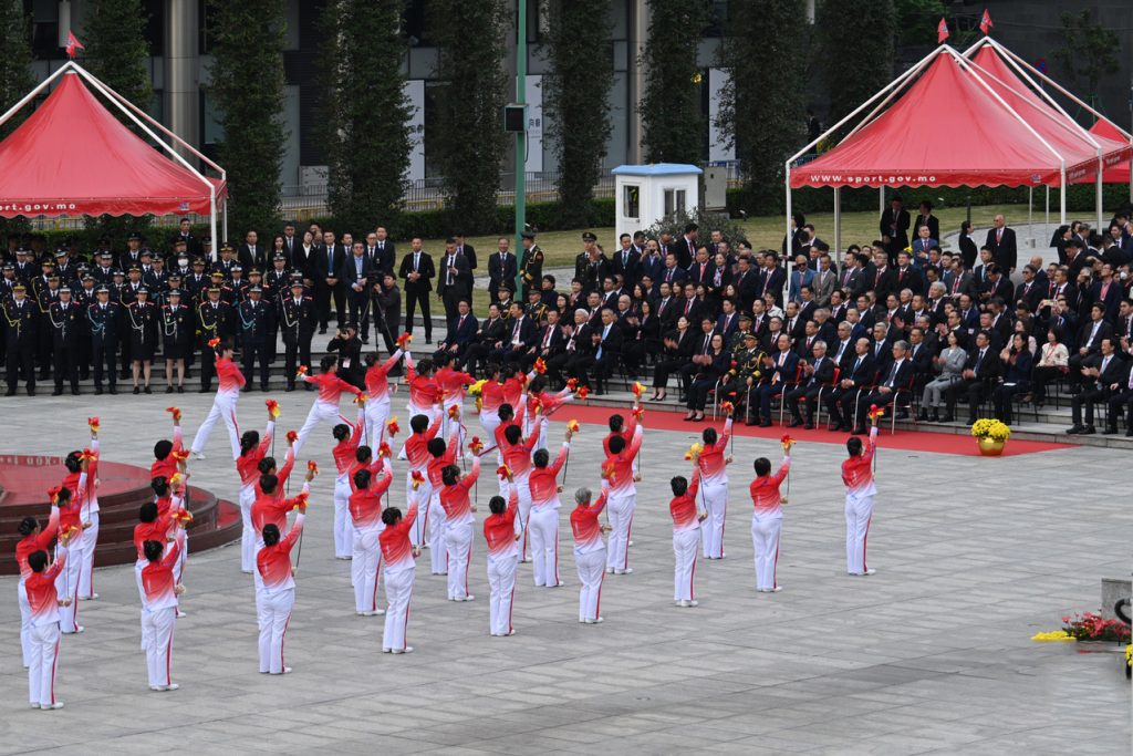 招待酒會前,特區政府早上8時在金蓮花廣場舉行慶祝中華人民共和國澳門特別行政區成立26周年升旗儀式,行政長官、中央駐澳機構負責人、特區立法及司法機關負責人、政府主要官員、行政會委員、立法會議員及各界人士等約550人出席。
