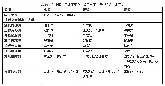 自2013年起,公司定期嘉許一眾積極實踐「因您而用心」服務精神的傑出員工,其四大核心價值包括態度親切、表現專業、主動用心及團結一致。每年,頒獎盛典均會表揚及分享員工真誠暖心、盡職盡責的職場故事,讓公司上下同仁深受啟發。這份以人為本、相互肯定的精神,也促使金沙中國在2025年榮獲國際權威認可的「傑出僱主」認證,成為澳門旅遊服務業界首家獲得此項國際認可的企業,也是亞太區業界首家獲此殊榮之綜合度假村營運商。