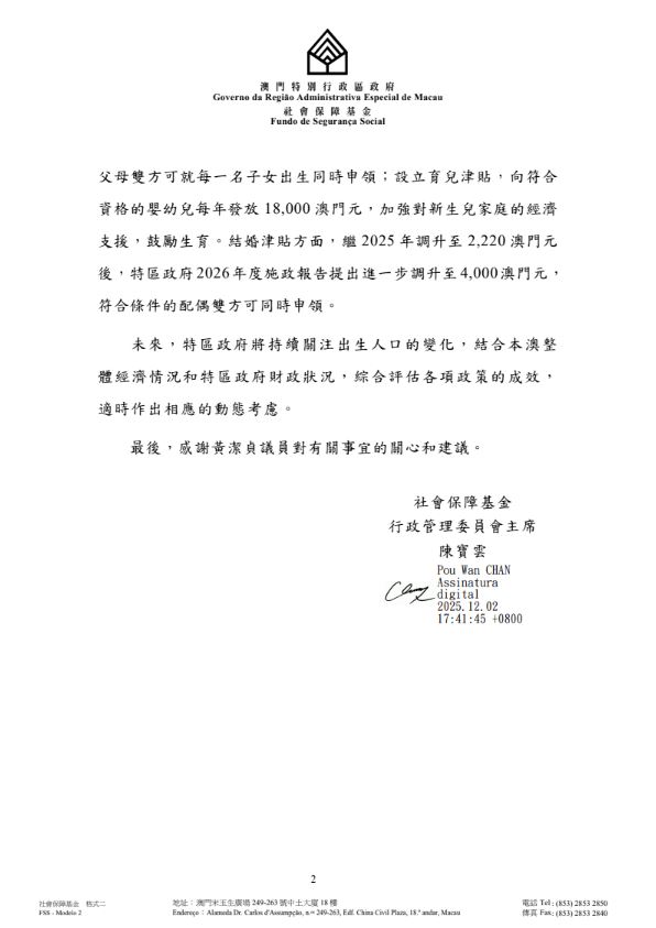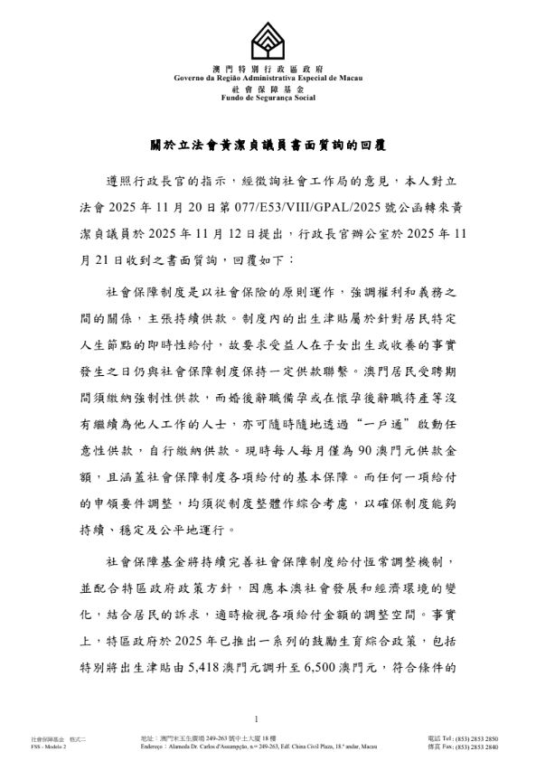 澳區政府社會保障基金關於立法會黃潔貞議員書面質詢的回覆如下: